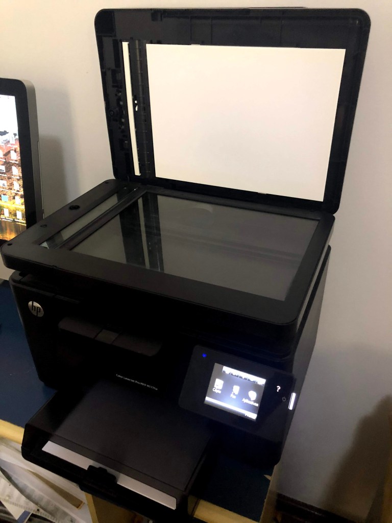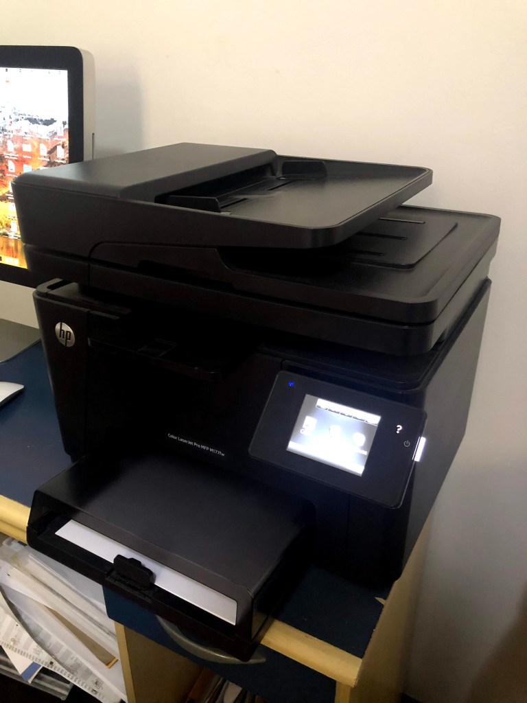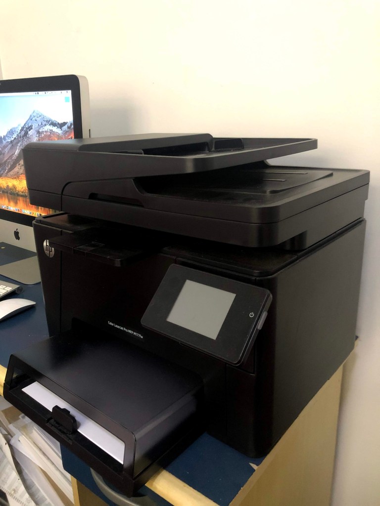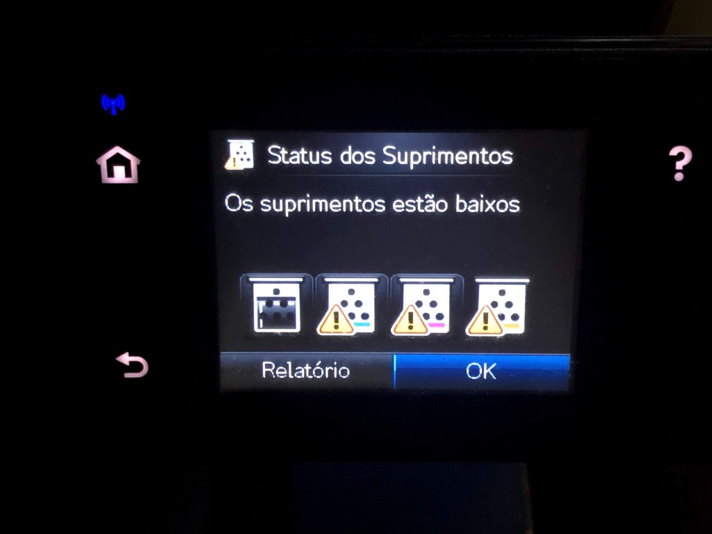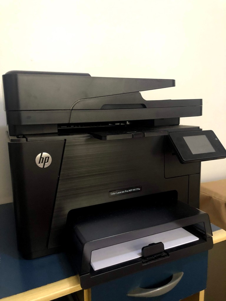 Impressora HP Color LaserJet Pro MFP M177fw. Toner original preto cheio, toner original colorido acabando. Com Wi-Fi (para imprimir e digitalizar), impressão por e-mail e função cópia.